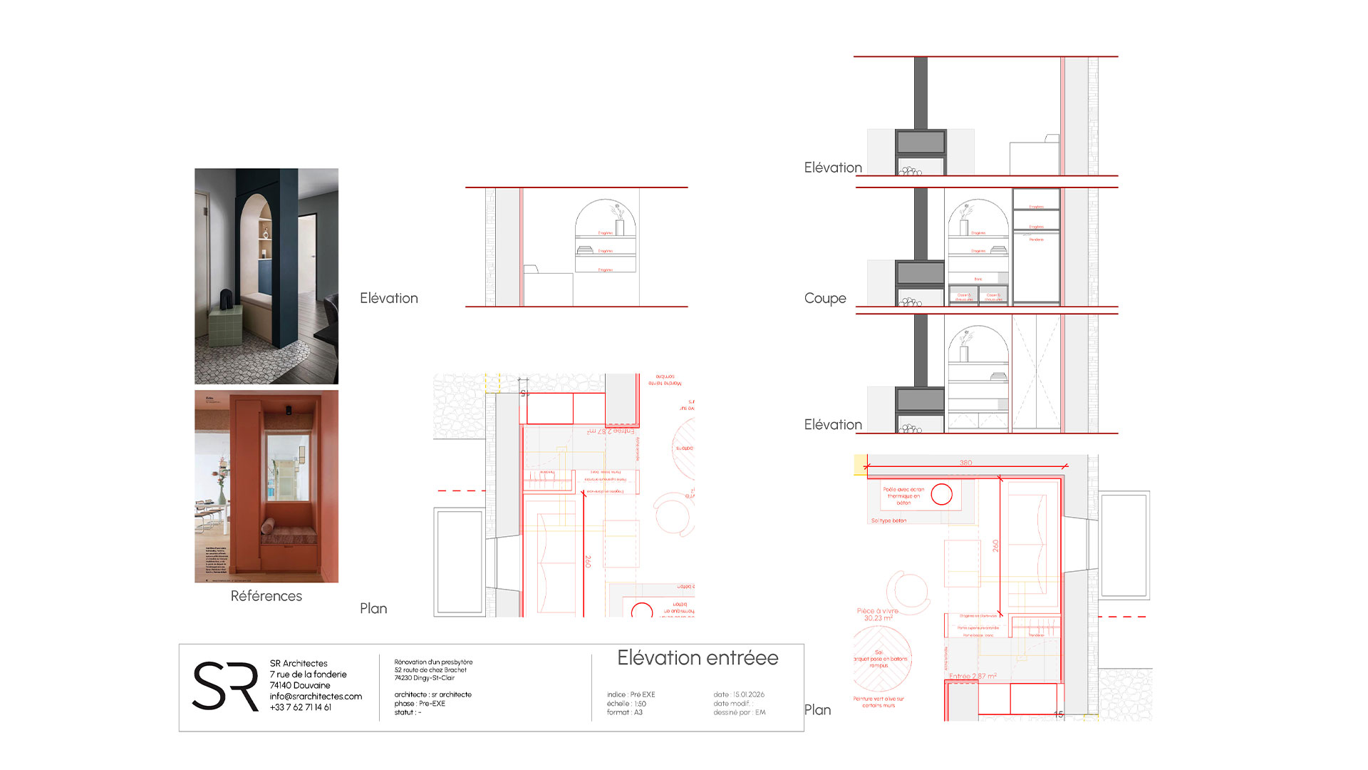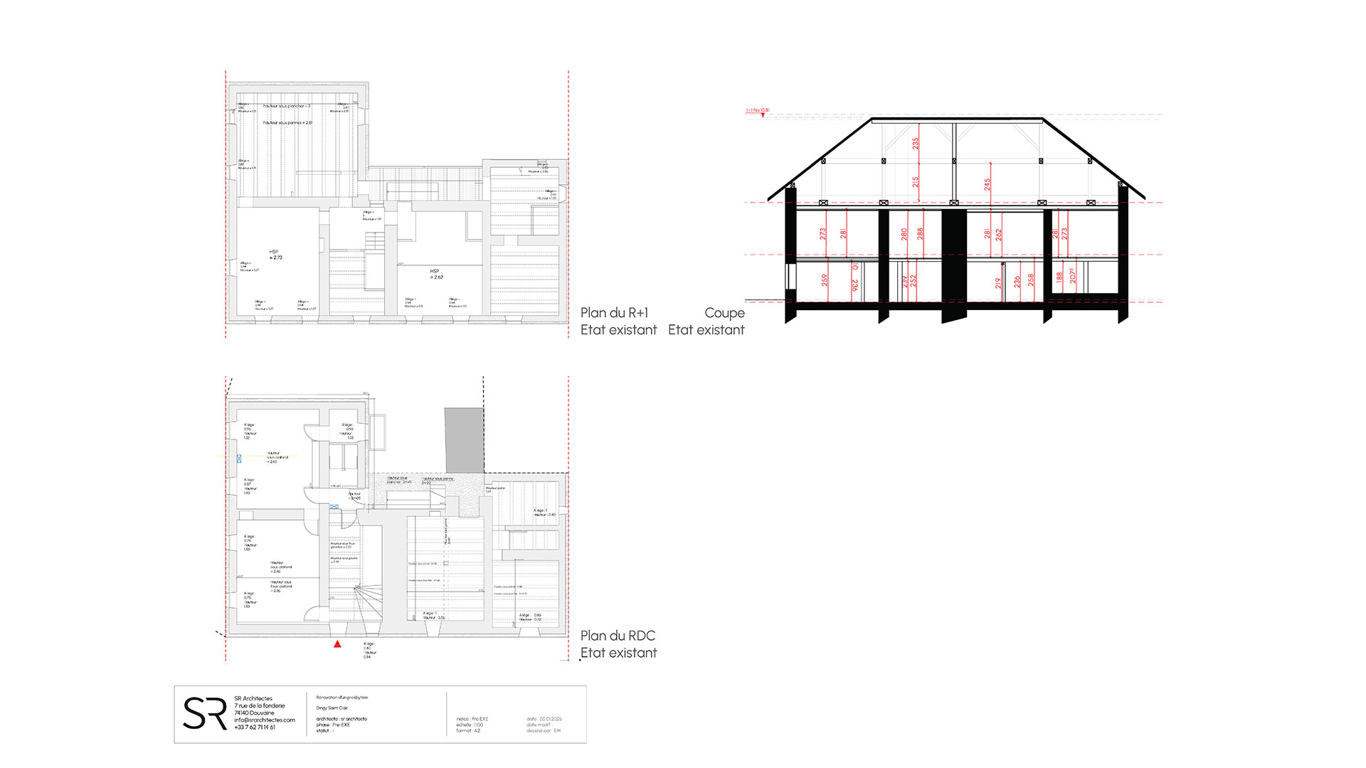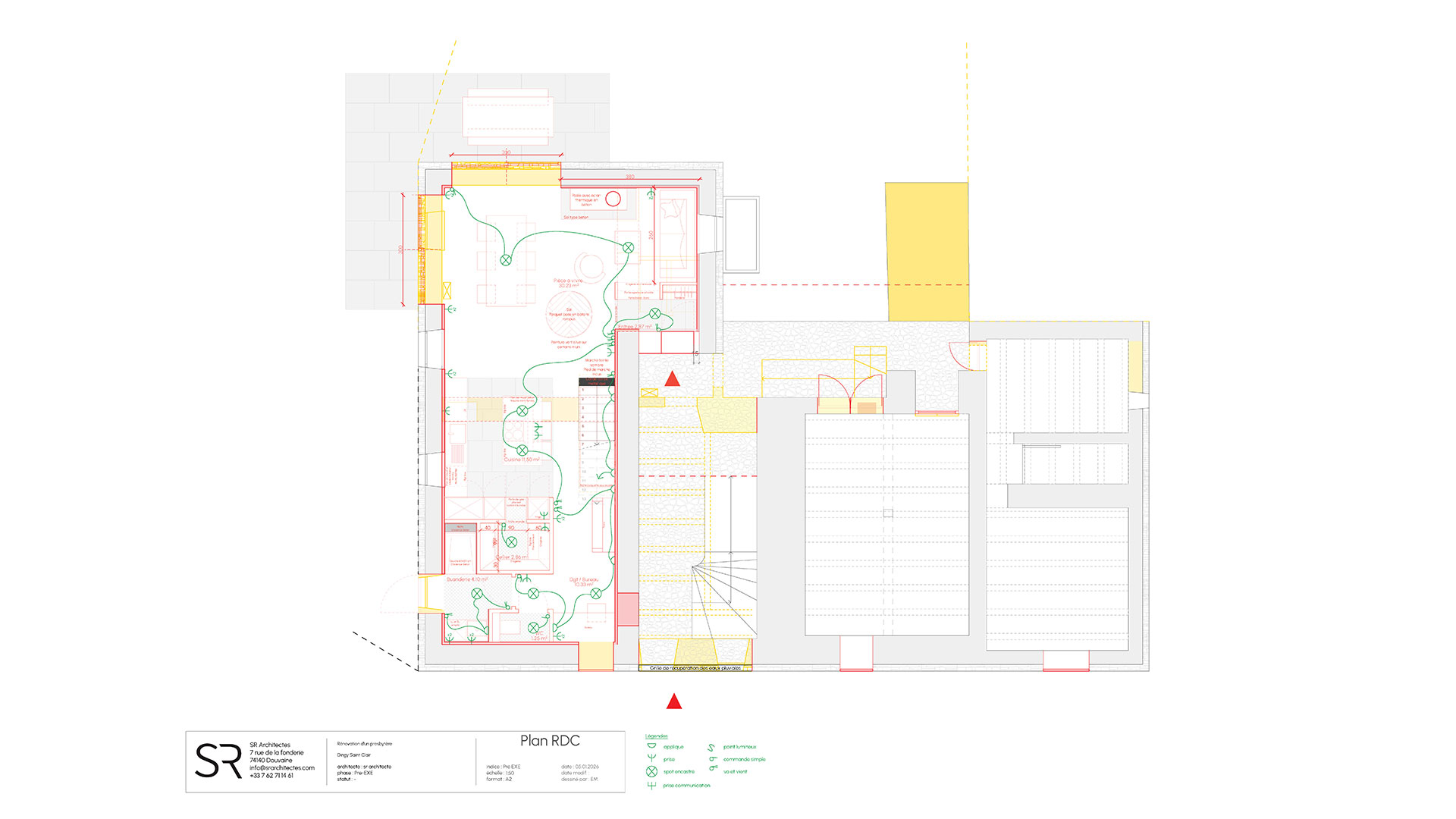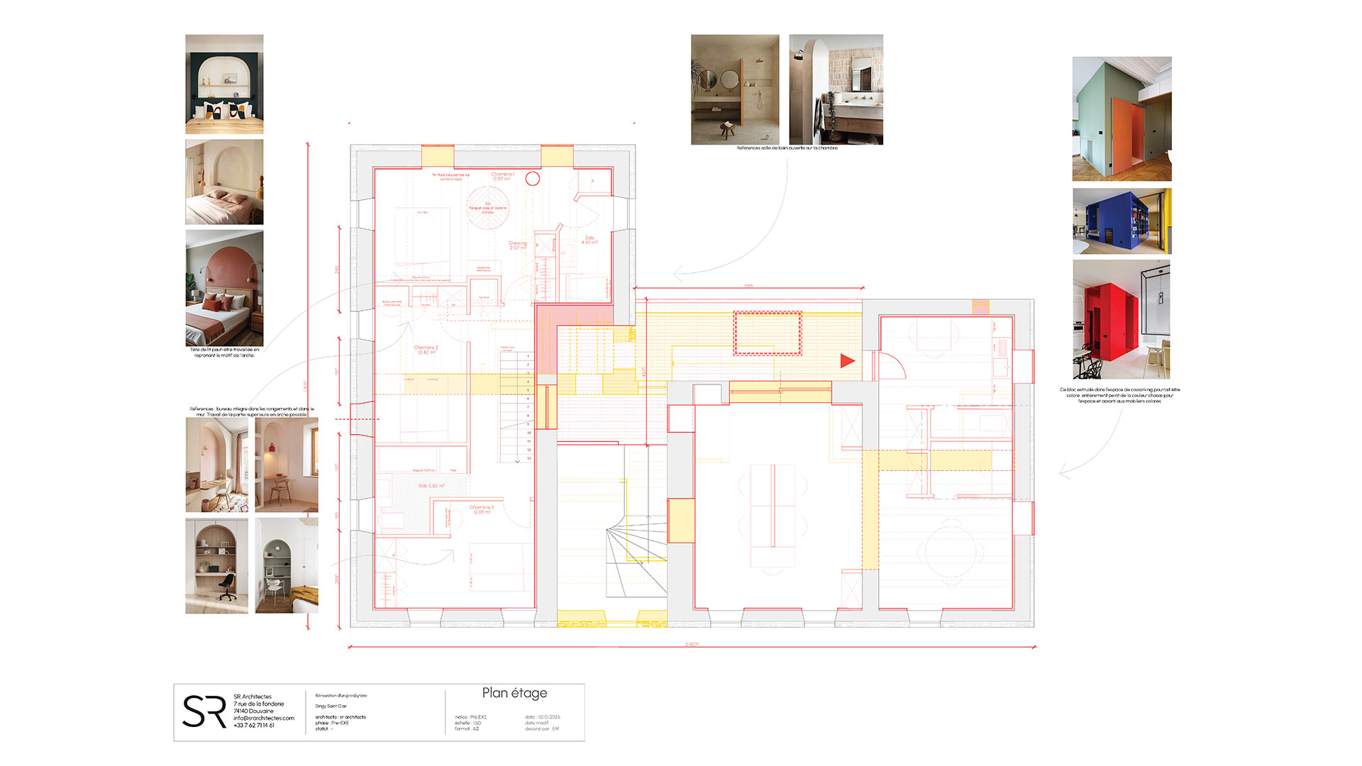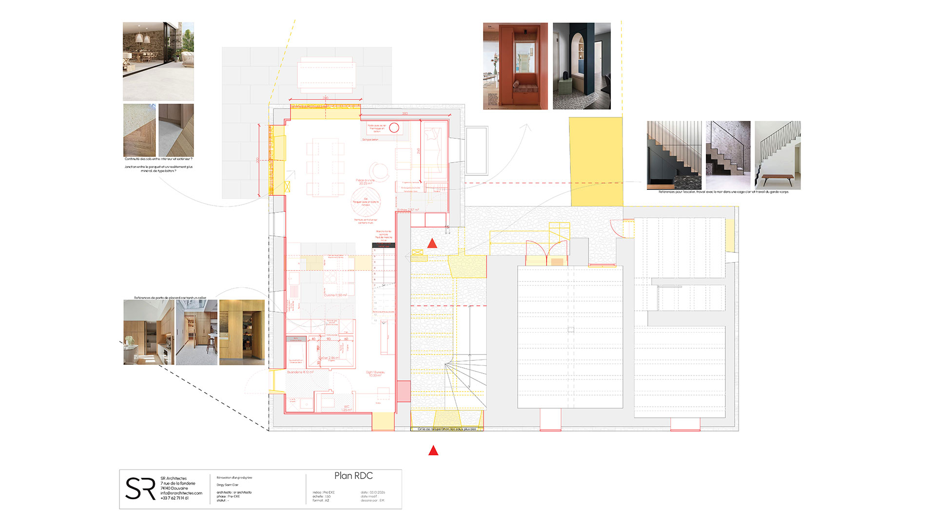 Le projet s’appuie sur la création de deux entités, associant un logement principal (dans la partie Sud du presbytère) et un espace de travail (dans la partie Nord du presbytère).