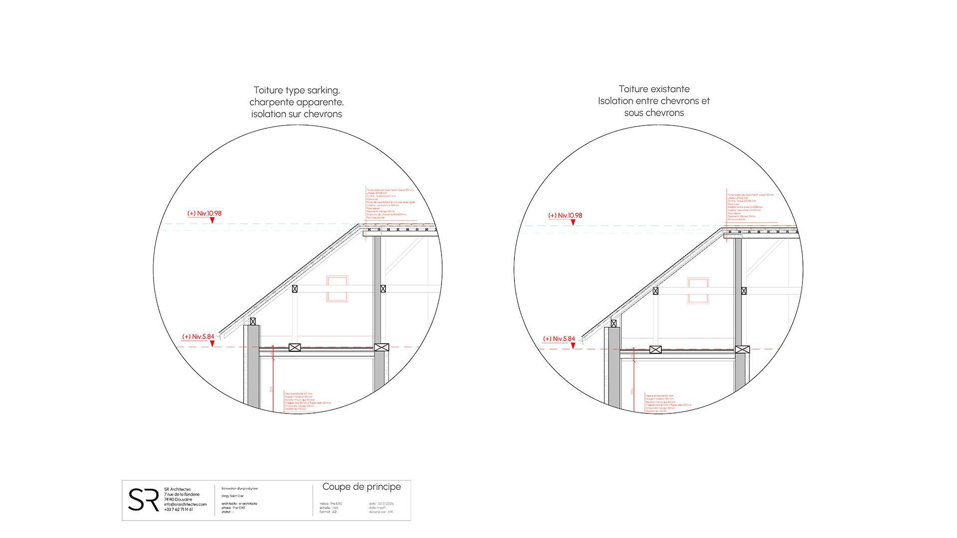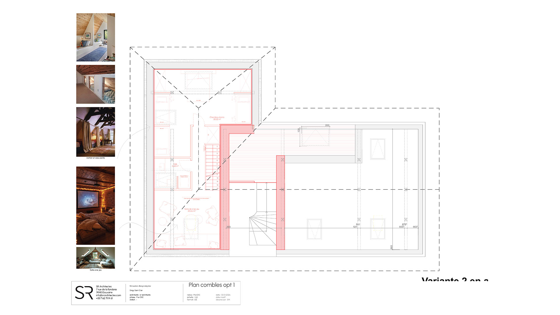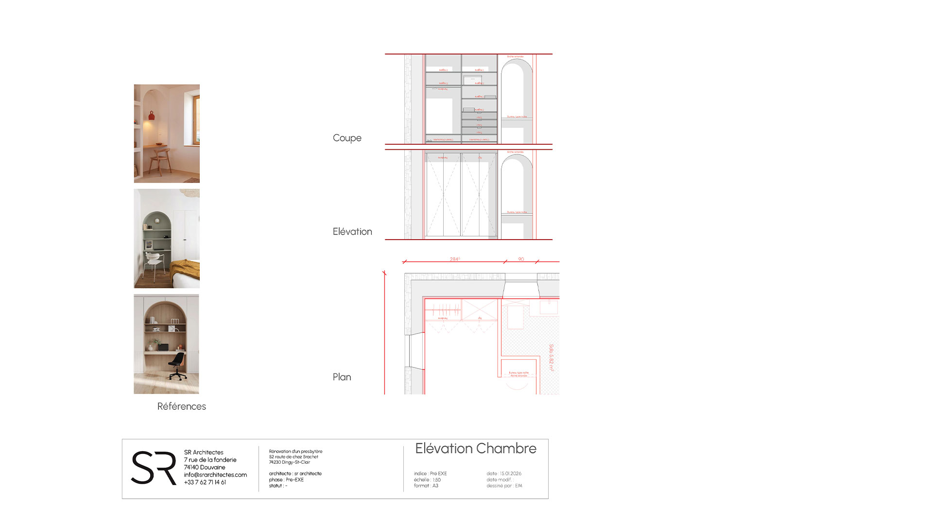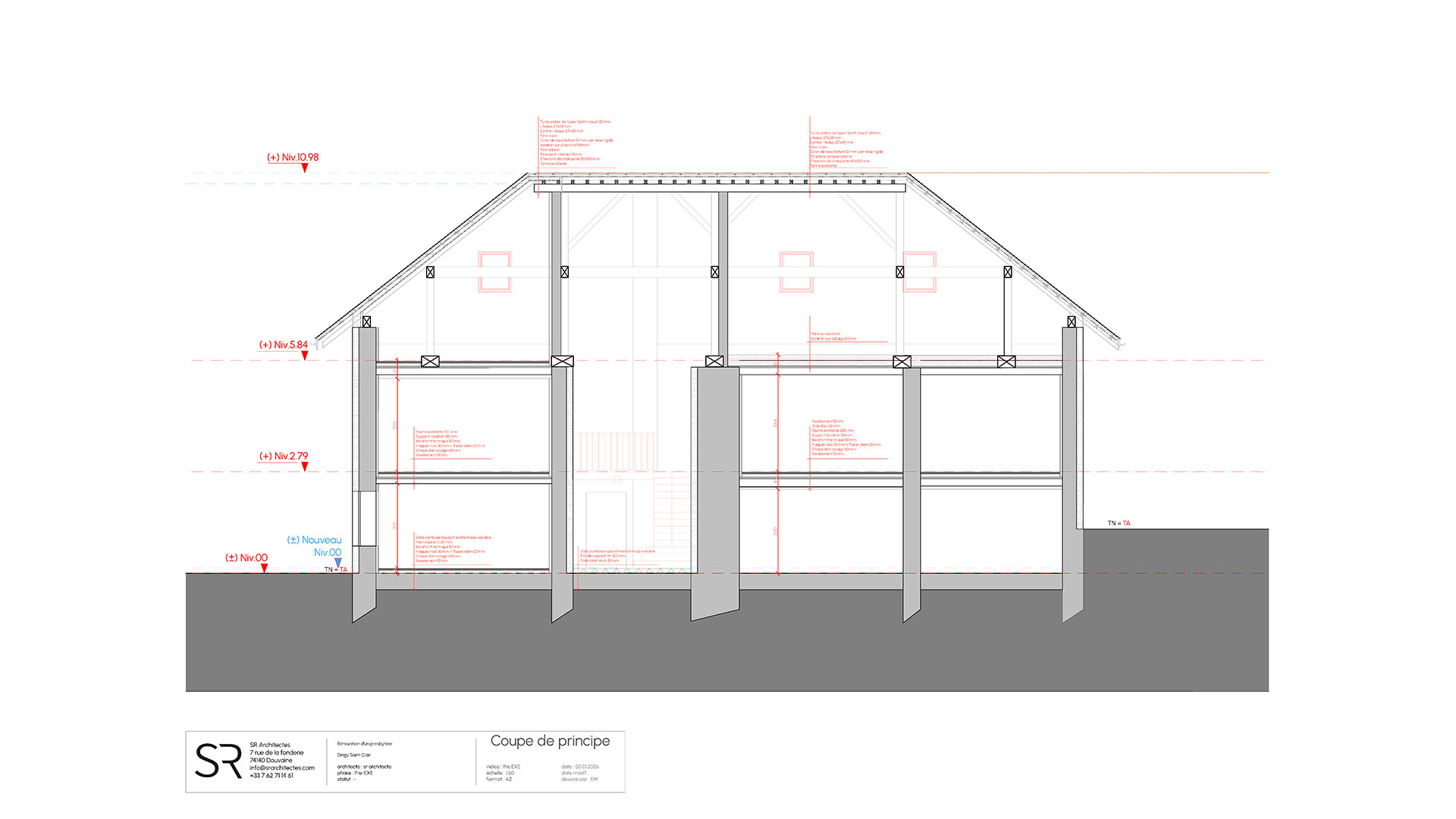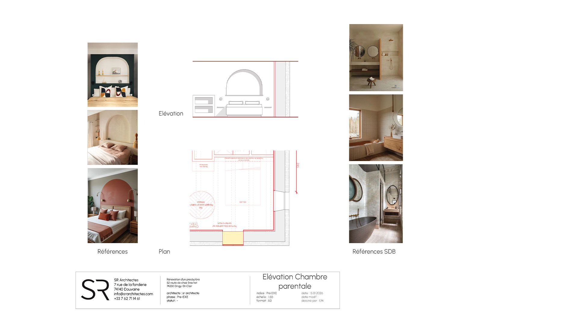 Le projet s’appuie sur la création de deux entités, associant un logement principal (dans la partie Sud du presbytère) et un espace de travail (dans la partie Nord du presbytère).
